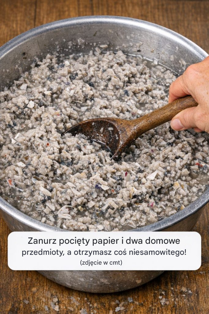 - Po namoczeniu wymieszaj i rozdrobnij papier starą drewnianą łyżką, aż powstanie gładka papka.
