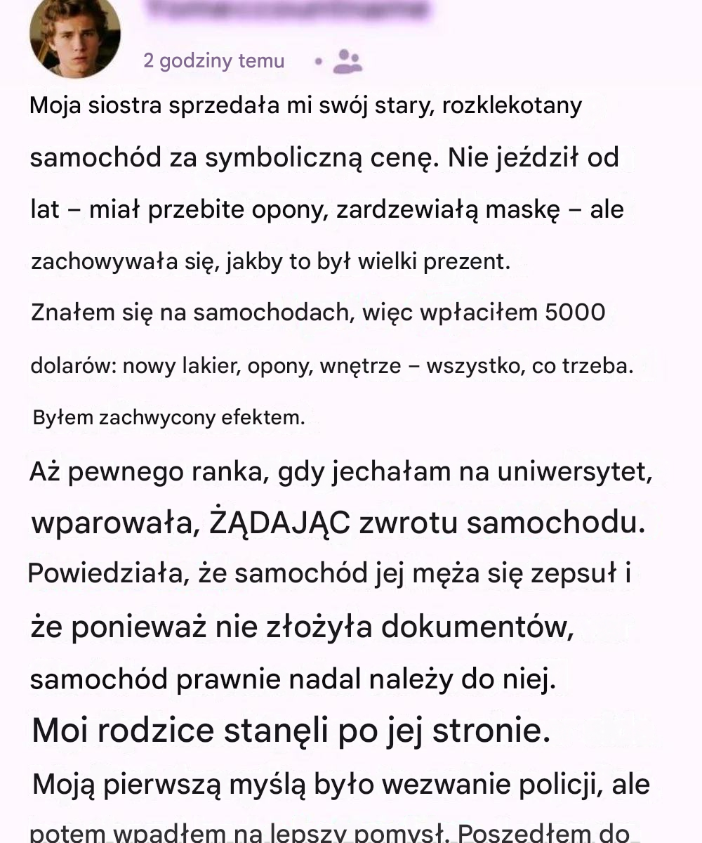 Moja siostra Elena zawsze miała talent do dramatyzowania. Kiedy „sprzedała” mi swój stary, rozklekotany sedan za symboliczne pięćdziesiąt dolarów, nie tylko wręczyła mi kluczyki – ale wręczyła przedstawienie. Zachowywała się, jakby dawała mi w spadku bezcenną rodzinną pamiątkę, złoty rydwan, który poniesie mnie w przyszłość.