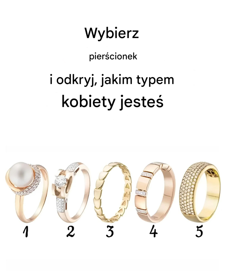 Spójrz na pięć pierścionków poniżej ( lub wyobraź je sobie, jeśli nie ma obrazka ) i bez zastanowienia wybierz ten, który najbardziej Ci się podoba. Następnie odkryj, co ten wybór mówi o kobiecie, którą jesteś. Gotowa? Zaczynajmy!